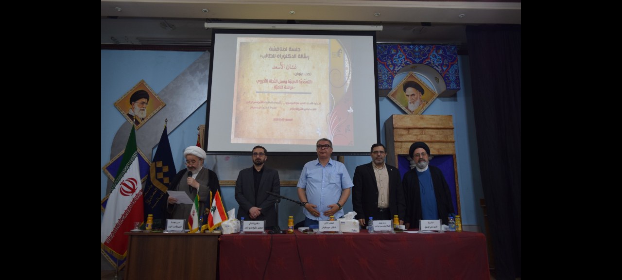 نظّمت حوزة الرسول الأكرم صلى الله عليه وآله ـ فرع جامعة المصطفى في لبنان ـ جلسة لمناقشة أطروحة الطالب "الشيخ غسّان ناجي الأسعد" المعدة لنيل شهادة الدكتوراه في الكلام الإسلامي، وذلك يوم الجمعة الواقع في 10/10/2025. وجاءت تحت عنوان: التعددية الدينية وسبيل النجاة الأخروي، وتشكّلت لجنة المناقشة برئاسة معاون التعليم في جامعة المصطفى في لبنان سماحة الشيخ قاسم آخوند وعضويّة كلّ من المشرف السيّد علي الموسوي والمشرف المساعد الشيخ سمير خير الدين، والقارئين الشيخ الدكتور فادي ناصر، والدكتور حبيب فيّاض، وقد حضر الجلسة المدير العام لجامعة المصطفى في لبنان سماحة الشيخ مهدوي مهر، ومدير حوزة الرسول الأكرم سماحة الشيخ محمد زراقط، بالإضافة إلى عدد من أساتذة الحوزة وطلابها. وقد نال الطالب علامة 18/20 بتقدير ممتاز على أطروحته .